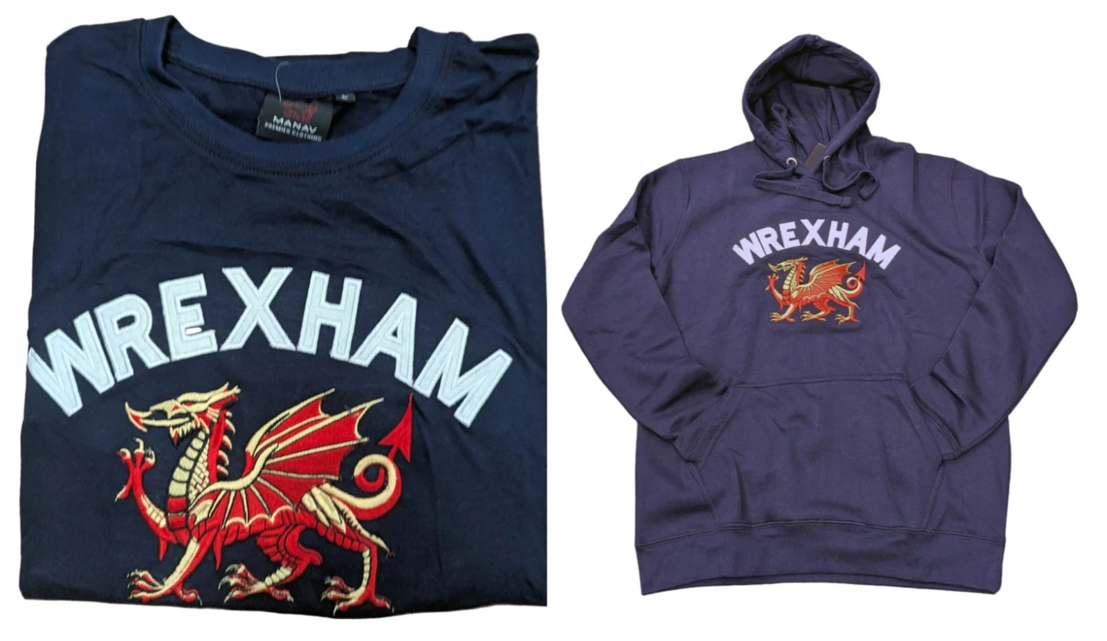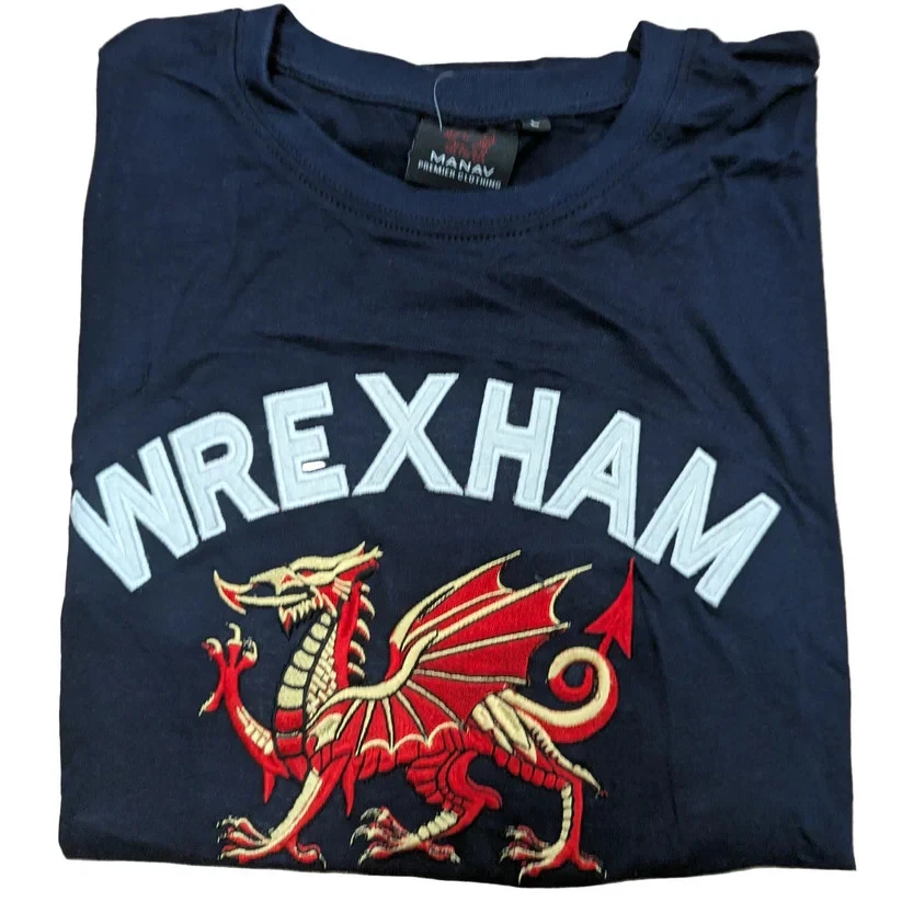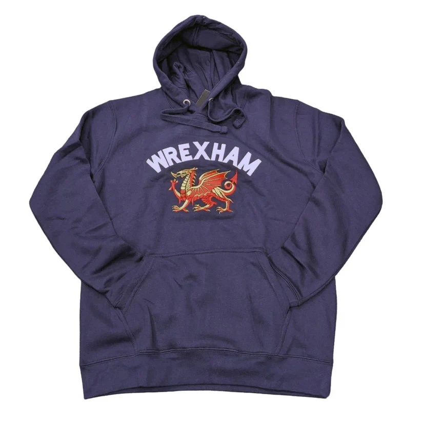 The New Adults Wales Embroidered ‘Wrexham’ Red Dragon Navy Hoodie or T-Shirt by Manav is a stylish and comfortable garment suitable for both men and women. Made from a cotton blend fabric, this hoodie features a round neckline, red dragon pattern, and is machine washable for easy care. The navy colour and embroidered accents add a touch of flair to the pullover style hoodie, which also includes a hood and pockets for added convenience. Perfect for those looking for a regular fit garment with a bit of Welsh flair.