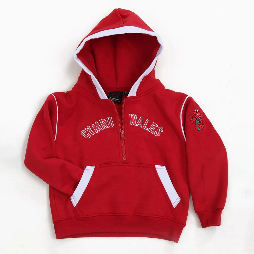 This hoodie is perfect for young boys who love stylish and comfortable clothing. The hoodie is made of a polyester blend, making it machine washable and easy to care for. It features a 1/2 zip closure and is designed with the Welsh Dragon embroidered in red, giving it a unique and patriotic look. The hoodie comes in red and is suitable for boys aged 2-16 years. The style is perfect for casual wear and can be paired with different outfits. The hoodie is from the brand Manav and is part of the Boys’ Clothing category. Get your little one this stylish hoodie today and let them show off their Welsh pride!