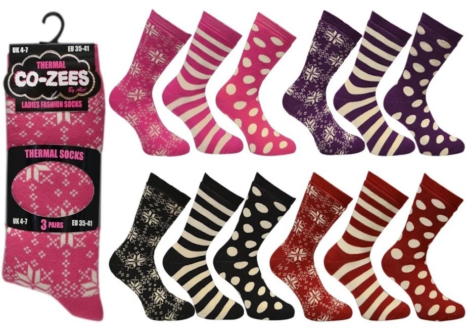 Introducing the new Co-Zees Ladies 3 Multi Pairs Fair Isle/Spots/Stripes Cotton Rich Thermal Socks. Made from 85% cotton, 14% polyester, and 1% elastane, these mid-calf socks are not only stylish but also comfortable and warm, perfect for the colder months. The full toe style and UK size 4-7 make them suitable for most women, while the machine washable design ensures easy care. Add a touch of style to your wardrobe with these versatile thermal socks that come in a pack of 3 pairs.