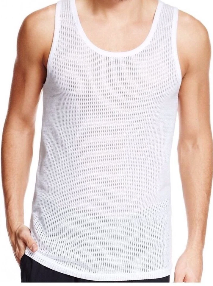 This is a pack of 6 men’s white tank top vests perfect for gym training during the summer. Made of 100% cotton jersey fabric, the vests feature a breathable mesh eyelet pattern and a crew neck design. The sleeveless style provides a fitted silhouette, ideal for staying cool and comfortable during workouts. Machine washable for easy care, these vests are a practical and stylish addition to any man’s activewear collection.